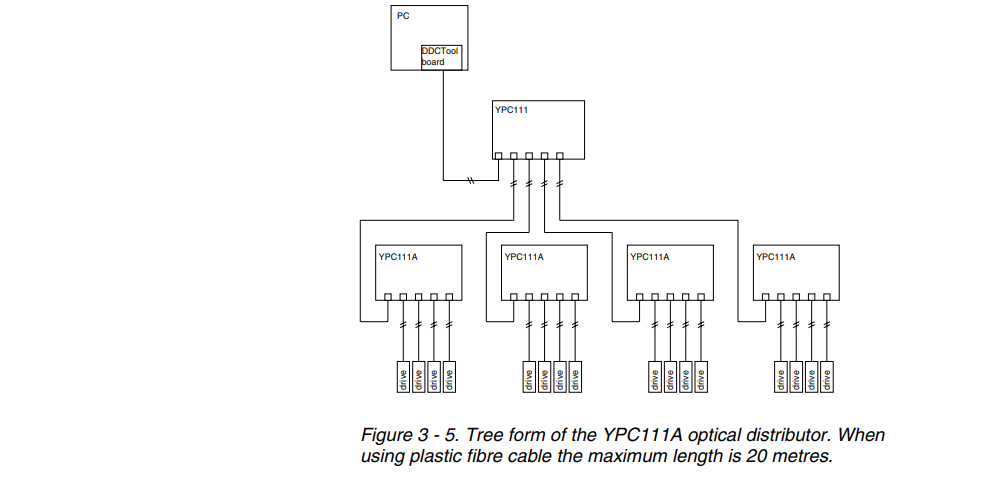 If there are several DDCs and only one PC, YPC111A optical distributors can be used between the DDCTool board and the DDCs. YPC111A has one connection for the DDCTool board and four connections for the DDCs or lower level optical distributors. When using the YPC111A board and plastic fibre cable, the maximum length between the boards is 20 metres.