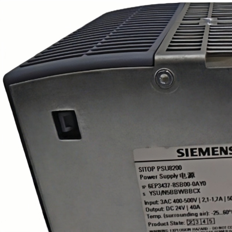 The 6EP3437-8SB00-0AY0 power supply, part of its SITOP range. This component is designed to operate within an input voltage spectrum of 400 to 500 VAC and draws 2.1 A at 400 VOLTS. It supports a dual frequency of 50/60 Hz, making it versatile for various applications.